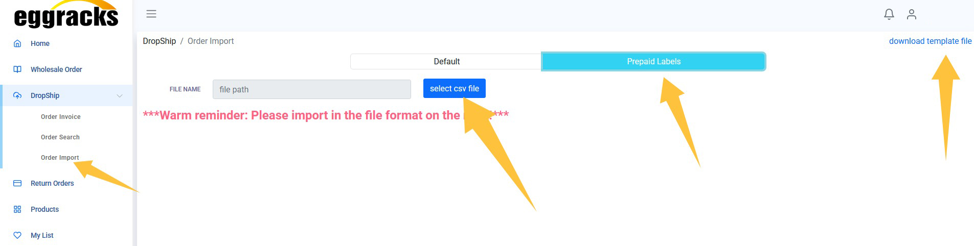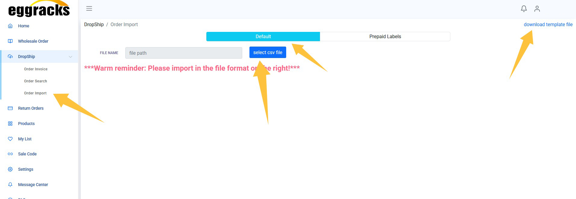 You can import orders via .csv or API. Please visit our FAQ page in seller center for .csv instructions. Another option is to automate the process via API. We have many plugin APPs ready to connect with Shopify, Walmart, eBay, etc and we can always set up new ones as needed. Please contact our sales team by emailing [email protected].