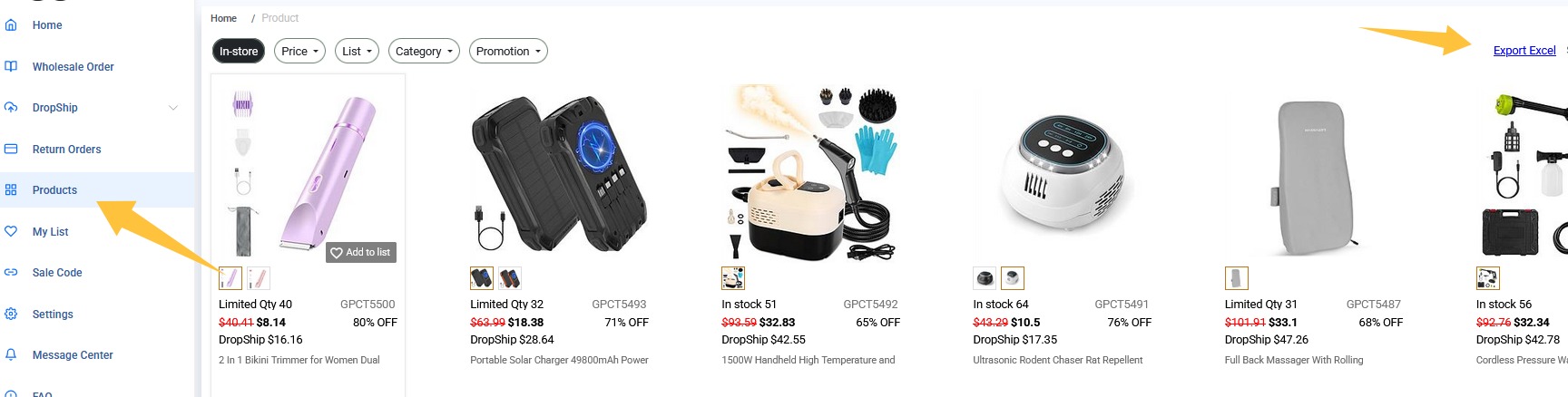 You can export/import via .csv or connect via API. Our product export will have the latest inventory, so please export from our portal and import to your portal daily to avoid out-of-stock orders.